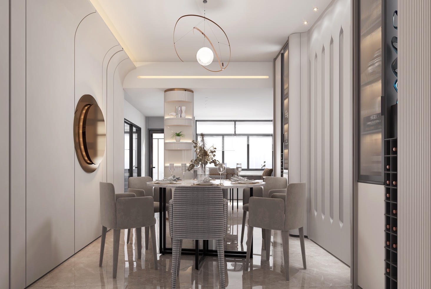 每一位居住者都需要有这样一片舒适的空间让你去享受美食——餐厅的地面与墙面所呈现的天然质感与多样纹路,让用餐者仿佛置于春光与流水的情景中,心情如沐春风般徜徉起来。用餐家具材质绵软搭配灰色系的餐椅中夹杂格子的纹理,是居住者独特审美的外露。灰白的空间色调、金色柔和的光线、绵软时尚的餐椅,恰如其分地演绎出舒适与时尚的完美杂糅,居住者生活步调的优雅感与生活态度的积极性在餐厅空间中延伸开来。
