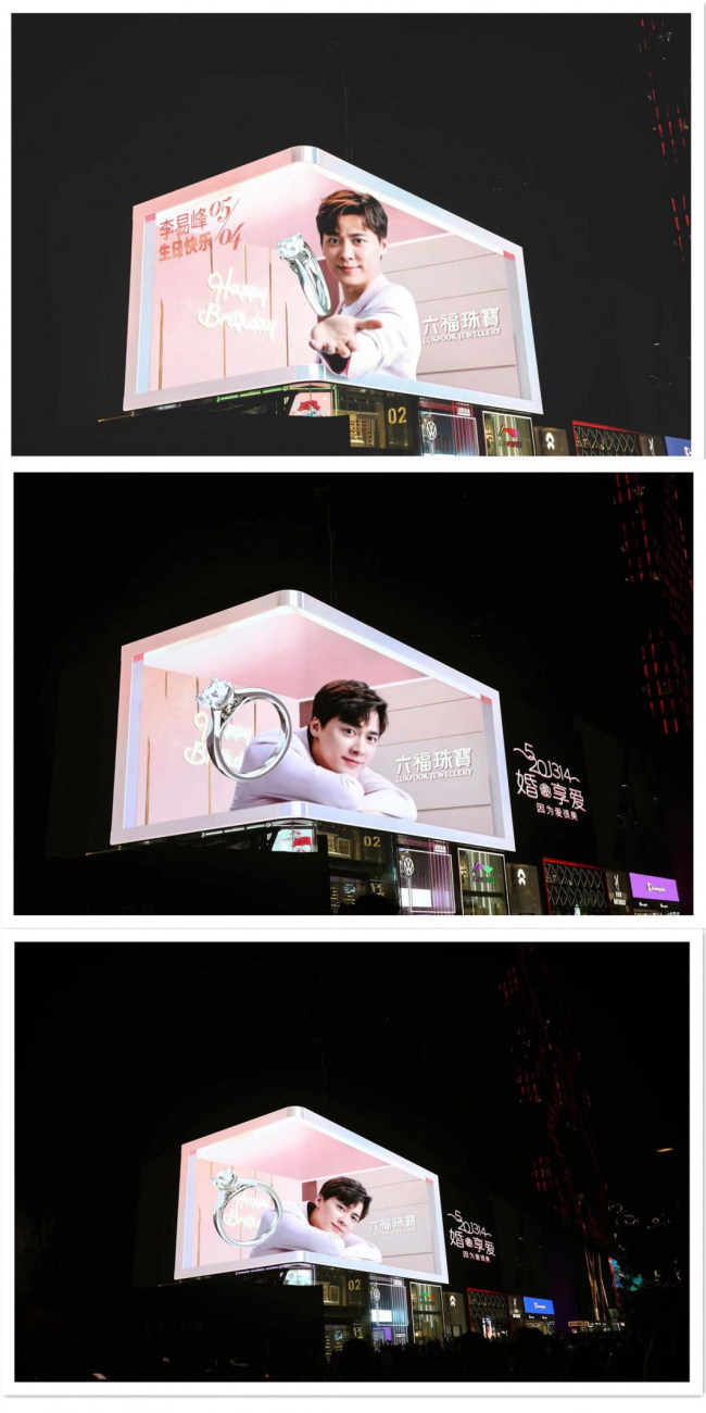 5月4日是青年的节日,也是”国民校草”- 李易峰的生日。在这个特别的日子里,六福珠宝为全球代言人李易峰霸屏庆生,特别版生日大片登录成都春熙路3D裸眼大屏,震撼的3D效果让帅气的李易峰呼之欲出,近在咫尺,引得游人驻足围观,现场粉丝更是尖叫连连。